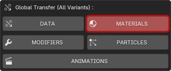Effortlessly transfer the selected object’s Data, Materials, Modifiers, Particle Systems or Animations to all existing variants in one click by using the global transfer buttons. Select an object and use the global transfer buttons of the — TRANSFERS — tab to push your transfer to all existing variants.