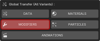 To transfer the selected object’s Modifiers to all variants, use the global transfer button of the TRANSFERS tab to commit to a full-scale transfer across all existing variants you have created.